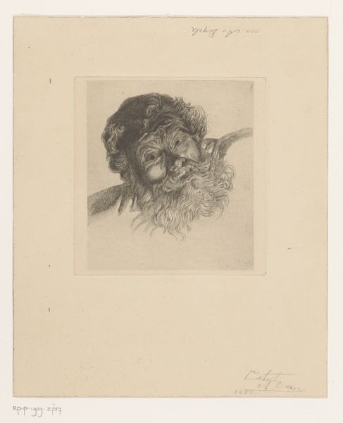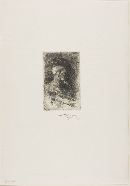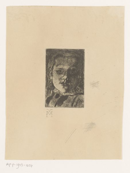 Editor: We are looking at “Kop,” an etching, an intaglio print made by Henri Braakensiek, probably before 1936. The face is so pale, the etching lines so fine; it reminds me of a fading memory. What do you see? Curator: What immediately strikes me is the masterful use of the intaglio technique to render form through tonal variation. Notice how the artist employs delicate lines, seemingly at random, to build up the shadows and volume in the face. The lines are not descriptive but relational; they have a life independent of representing external reality. How would you describe the composition? Editor: Well, it’s quite simple, really. Just the head, enclosed in a square. It makes me think that the shape traps the portrait. But there's an active energy despite that still face. Is this dynamic contrast unique to "Kop"? Curator: Not entirely unique, but exquisitely executed here. The artist contrasts this containment with a remarkable diffusion of light, a carefully calibrated field of illumination that both reveals and conceals. We see form emerge from near abstraction through an interaction between ink and paper. I ask you to think what occurs without lines present: absence itself contributes to the overall aesthetic effect. Editor: It’s as if the light and shadow aren’t just describing a face, but they’re active elements. You know, playing off one another. Thank you! I feel like I'm just beginning to see this print. Curator: Indeed. The essence lies not just in what is depicted but also in how it is depicted, an orchestration of material elements, generating an artwork of considerable formal depth. I, too, feel rewarded in recognizing how a deeper structural understanding expands appreciation.