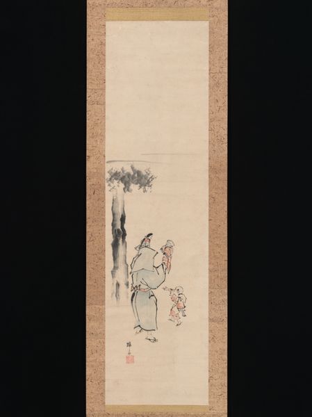 Curator: Welcome. We're standing before "The Brine Maiden Matsukaze," a tempera on silk attributed to Nishimura Shigenobu, dating to sometime between 1700 and 1733. Editor: It has a wonderfully muted palette. Something about it evokes a sense of melancholy, doesn't it? The seated woman seems burdened by an unseen weight. Curator: Notice how Shigenobu masterfully uses line and form to direct our eye. The delicate brushstrokes articulate the folds of her kimono, and the overall composition creates a sophisticated rhythm within the frame. We could also consider it in terms of "Ukiyo-e", translated as pictures of the floating world. Editor: And within that world, it is crucial to recognise this as more than just a depiction of female form. It's an engagement with themes of exile and longing. Matsukaze was an ama diver, a woman who harvested seaweed, later associated with a classical play about two sisters exiled for making salt. She sits, clinging to a pine tree that reminds her of her lost lover. The artwork becomes a potent symbol of loss experienced by those on the margins. Curator: While I concur regarding its poignant subject matter, the technical precision with which Shigenobu handles the medium shouldn’t be ignored. The layering of colours to achieve depth, the nuanced depiction of textures – silk, pine bark – these are triumphs of visual representation in their own right. I read it less as a polemic and more as formal triumph. Editor: Precisely, art of this era often subtly commented on socio-political issues. The seeming calm of the composition is actually layered with subversive undertones when read through the history of gendered labour, the burden of emotional lives lived outside conventional society. The gentle medium belies sharp commentary. Curator: An insightful analysis. It appears Shigenobu crafted a complex visual puzzle which blends stylistic form with social commentary. Editor: It just illustrates, once again, how Japanese art can function as both an aesthetic achievement and powerful record of women, love and social struggles.