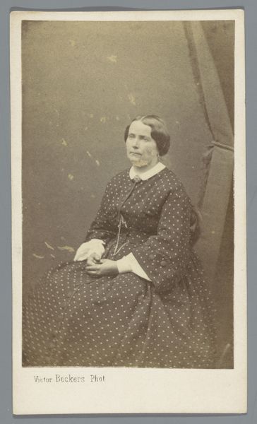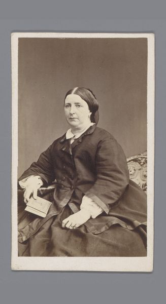 Editor: We're looking at a gelatin silver print entitled "Portret van een onbekende vrouw bij een tafel" (Portrait of an unknown woman at a table) created by Jean Rougeot de Briel, sometime between 1860 and 1871. It's quite striking how the fabric of the woman's dress dominates the composition; it seems almost sculptural. What do you see as the most compelling elements of this work? Curator: The gelatin silver print exhibits a keen interest in texture and form. Note how the artist utilizes light to sculpt the folds of the woman’s dress, emphasizing its voluminous quality. Observe the chromatic scale from dark grey in the background, moving in various shades, culminating to almost complete whiteness in the bright parts of her dress. Are you observing this too? Editor: Yes, the light definitely enhances the texture and shape. And the limited colour range seems to contribute to a kind of sombre mood. How does this influence its interpretation? Curator: Precisely! Semiotically speaking, this formal manipulation, this careful arrangement of light and texture, serves to amplify the visual weight of the figure. But beyond simple representation, it elevates the image to an exercise in form. We have here what could easily be viewed as one of the first, truly abstract, photographs, despite its ostensibly figurative form. Do you agree? Editor: I'm intrigued by that reading. Focusing on form and visual weight rather than pure representation... it offers a new way of seeing this rather formal portrait. Curator: Indeed. Through rigorous structuralist reading, this seemingly straightforward portrait unveils itself to be an exemplar exercise in manipulating photographic form and texture, predating much later movements. Editor: I hadn't considered it in such an abstract way. I learned a lot by examining the use of shapes in relation to its representative meaning. Thank you!