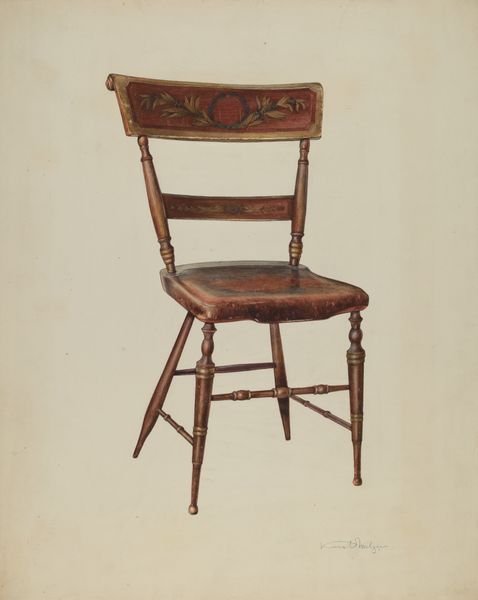 Editor: Here we have Charles Henning's "Pa. German Chair," created around 1939. It appears to be a watercolor drawing showcasing a wooden chair, likely intended to document or celebrate the craft. The level of detail in the painted decoration is intriguing. How do you approach this piece, considering its potential blend of art and craft? Curator: Well, first off, let's think about what it meant to document a Pa. German chair in 1939, particularly using the "high art" media of drawing and watercolor. Were such chairs valued? Who might have acquired them? Were these for use, or status? Because Henning has depicted this object, raising it from something that could simply be functional or decorative to something "worth" depiction. This elevates craft into something else. Editor: That’s a fascinating angle – the act of documentation conferring value. I hadn't thought about it that way. Curator: Think about the process here: The material used to construct the chair. Who labored to source it, form it? What cultural pressures, or constraints shaped them? The watercolorist must have a different economic status, but the artist saw value to copy it by drawing. How does that exchange occur, and what does that mean? Editor: So, you are less concerned about the chair itself and more interested in what this documentation says about art making? Curator: Exactly! By meticulously rendering the painted details, Henning transforms a vernacular object into a subject worthy of artistic attention. Are these high art or "craft" traditions? We need to unpack the implications of choosing this subject and these methods to understand its full meaning. This is about process, class, labor. It invites us to see craft as more than mere utility. Editor: I see that so clearly now! Focusing on the materials and the cultural context really shifts the focus away from just aesthetics. I appreciate how you frame this piece. Curator: Thinking about it from all sides gives the work renewed vibrancy and makes you consider the artist's social background.
