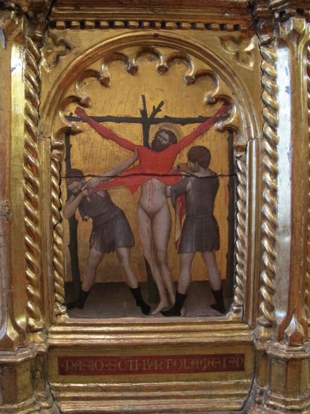 Editor: Here we have Giovanni da Milano’s "Martirio di S. Barnaba," made around 1370 using tempera paint. It’s striking how direct and unembellished the depiction of Saint Barnabas’s martyrdom is. What story does this painting tell within its historical moment? Curator: Indeed, this piece isn’t just about depicting an event; it's about constructing a specific visual narrative for its audience. Considering its original location, likely a predella for the Da Spedale della Misericordia altarpiece, this martyrdom takes on a new layer of meaning. How would the context of a charitable hospital influence the way people view this depiction of suffering? Editor: It feels like it might serve as a potent symbol of sacrifice and resilience in the face of hardship, which resonates well with patients. What is the importance of visualising the story like that for the public role of art? Curator: Precisely. The Italian Renaissance wasn’t just a rediscovery of classical aesthetics, it was also a strategic deployment of images to reinforce religious and social structures. The emotional directness would allow those interacting with this piece to personally identify with the imagery of St. Barnaba and thus to encourage public devotion. How do you see the politics of imagery playing out here? Editor: By making such a brutal event almost approachable, maybe even beautiful in its composition and colour, the painting softens the edges of harsh reality and makes faith a little more… palatable? Almost like a form of institutional promotion. Curator: Exactly! It brings up important questions about how power structures use visual narratives to perpetuate certain ideologies, even through acts of apparent piety or artistic expression. Reflecting on this dialogue, what stands out for you regarding the relationship between art, history, and public perception? Editor: I hadn't initially thought about the setting as shaping its reception. I will never see devotional paintings in the same way! It makes me consider art’s role in society in a very new light.