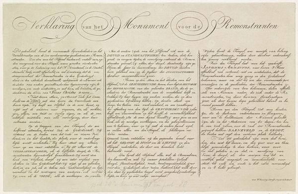 Jan Gerritsz. Visser created this print in 1793, titled 'Verklaring bij de prent met de Gedenkzuil voor de Zeven Verenigde Provincies', or 'Explanation of the print with the memorial column for the Seven United Provinces'. It’s an etching, a printmaking process using acid to corrode lines into a metal plate, which are then inked and transferred to paper. The dense text and intricate border demonstrate the technique’s capacity for fine detail. The print is both a product of skilled labor and a commentary on society. Etchings like this were relatively accessible, a means of circulating ideas and information widely. The text, combined with the allegorical imagery, speaks to the political context of the time, the aspirations and anxieties of the Seven United Provinces. Consider the labor involved - the artist's skill, the printer's craft - and the social function of this object. It’s a reminder that even seemingly simple prints are complex artifacts, embedded in their time and place. They challenge any neat separation between art, craft, and social commentary.
