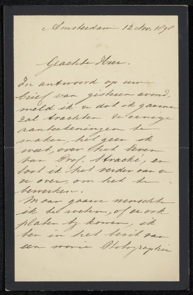 This is Ariette Sophia Jeannette Mauve-Carbentus’s letter ‘Brief aan August Allebé’ written in 1873. The elegant, looping script of the handwriting immediately draws us into a world of personal communication, where each stroke of the pen carries both information and the writer's unique touch. The visual structure of the letter is defined by the contrast between the dark ink and the pale paper. Note how the lines of text create a series of horizontal bands across the page. This ordered layout provides a framework for the more expressive qualities of the handwriting. The letter isn't just about what it says, but also how it looks. Considered as a semiotic object, the letter speaks of a particular time and place, of social conventions and personal relationships. It invites us to reflect on the act of writing itself, and on how we communicate with each other today. The careful script, with its variations in pressure and rhythm, demonstrates the author’s presence and intention. This letter presents an alternative way of thinking about language and communication.