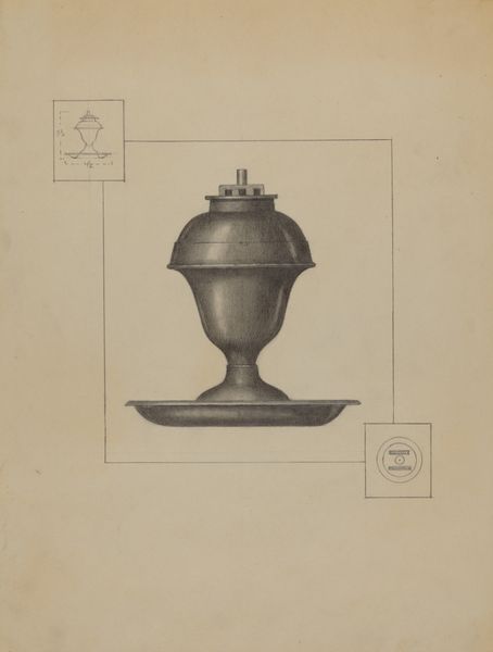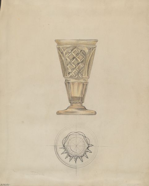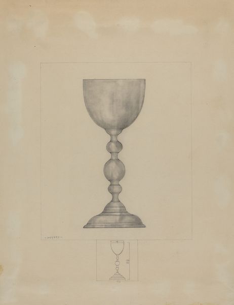 Editor: This is Henry Meyers’ pencil drawing of a Pewter Chalice, created around 1936. I’m struck by its precision; it feels almost like a blueprint, very technical. What can you tell me about it? Curator: It's interesting you see it as a blueprint. That precision reflects a very particular moment in the history of design. Consider the social context: 1936 was deep in the Depression era. Craftmanship, even in rendering, had to demonstrate its practical value. This isn’t just an artistic impression; it's a demonstration of how something could be manufactured. Editor: So, you're saying the economic conditions influenced the *style* of the drawing itself? Curator: Absolutely. The drawing ceases to be purely representational, but an argument for function and industry, mirroring the socio-political need for tangible solutions and efficiency. Also, think about the role of religious imagery. Editor: It's a chalice, of course, suggesting religious use, but what about that era in particular? Curator: Right, the mid-30s saw various forms of social upheaval globally. Was this Meyers' comment or refuge during these times? Or, on a different angle, chalices are usually ornate, full of jewels; pewter offers something a little more down to earth...almost… democratic? Does that democratizing impulse change how we understand religious practice? Editor: That makes me see the drawing in a whole new light. The details, like the scale measurements included, now read less like technical details and more like social commentary. Thanks for the insights! Curator: My pleasure! It just reminds us to question the forces influencing artistic expression. Art never exists in a vacuum.