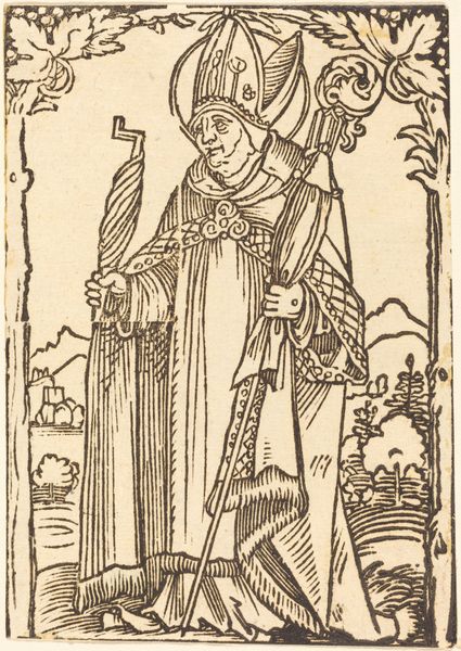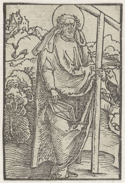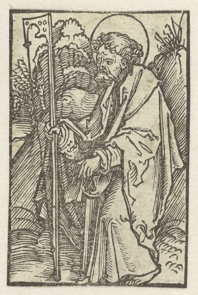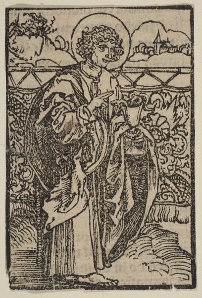 This is Albrecht Durer's woodcut "Heilige Barbara," made sometime around 1500, now at the Rijksmuseum. The figure of Saint Barbara is rendered through a series of tightly packed parallel and cross-hatched lines, which create areas of dense black and stark white. The composition is structured by the verticality of Barbara’s figure, which rises from the rough ground through a patterned plane to the skyline. Durer uses line to define form and texture, such as the intricate folds of her dress and the delicate details of her crown and chalice. The repetitive use of line flattens the image and focuses attention on the surface, emphasizing the graphic quality of the woodcut. There is a symbolic tension between the chalice and the tower in the background, as the saint embodies the transition from the medieval to the Renaissance through her faith. Consider how Durer has engaged with the materiality of the woodcut medium. The high contrast and linear precision reflect a shift towards a more graphic and symbolic mode of representation, challenging fixed meanings and inviting reinterpretation.
