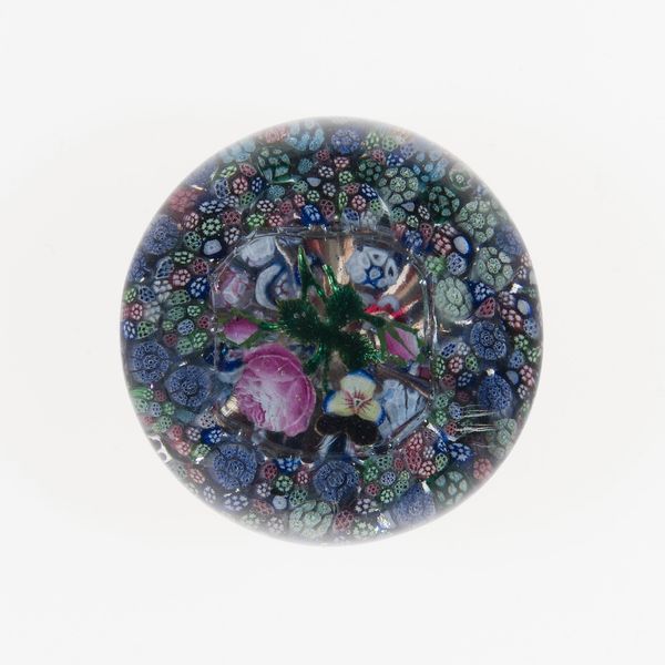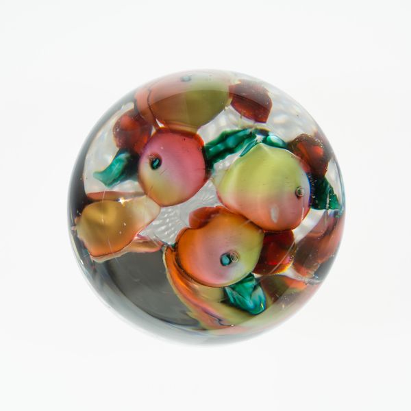 This is a handcooler made from glass by the Compagnie de Saint Louis. Its spherical form invites touch, a tactile experience enhanced by its smooth, cool surface. The interior reveals a complex, almost kaleidoscopic composition. Clusters of millefiori flowers are suspended within the glass, encircled by fragmented images and text. These elements are not randomly placed, but rather arranged to create a sense of depth and visual layering, drawing the eye into the heart of the object. The use of glass as a medium is particularly significant. It allows for transparency and opacity to coexist, distorting and refracting light. This play of light and shadow challenges fixed perspectives, mirroring the way meaning itself is always shifting, never entirely graspable. The flowers and text, sealed within the glass, suggest a desire to preserve and memorialize, yet their fragmented nature acknowledges the inevitable passage of time and the fragility of memory.