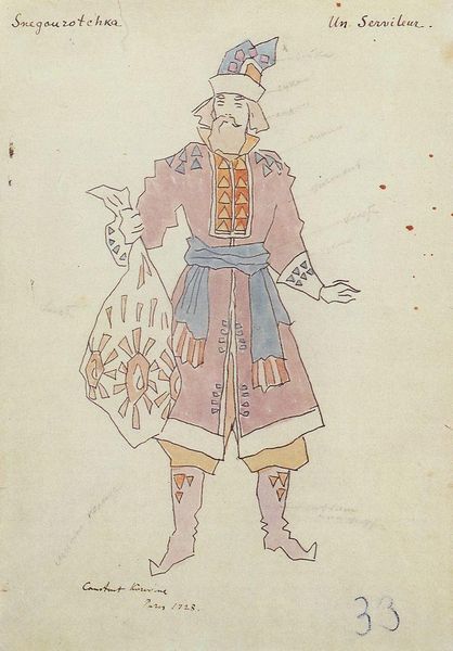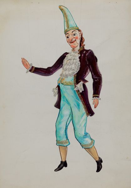 Curator: Here we have Lillian Causey’s “Man’s Suit,” likely created around 1936. It’s rendered in watercolor and drawing. What springs to mind for you, Editor? Editor: Frivolity, dare I say! A cotton-candy dream in watered-down rouge. The meticulous detailing—the frills, the floral, the very confident stance—suggests a playful commentary on wealth, maybe even a jab at masculine affectation. Curator: Absolutely. The labor involved in the creation mirrors the labor involved in producing the clothing of the time, emphasizing how much craft underpinned even aristocratic appearances. Notice the fabric swatch up there on the left. The drawing gives us an impression, yet it’s also presenting possibilities, choices of pattern and form to consider as commodities. Editor: It’s like a paper doll, waiting for the world, but with an attitude. I imagine Causey saw the theatricality in everyday life—these historical recreations, if you will, offered a means to comment on the stage of modern society too. It has that slightly sad, knowing glamour, that almost feels... vulnerable? Curator: That's interesting because fashion plates such as this had several lives, often appearing in magazines like "Harper's Bazaar," catering to the upper crust while also educating burgeoning manufacturers on what was considered cutting-edge style. "Vulnerable" makes sense because the drawing reveals the choices, labor, and context that mass marketing elides. Editor: Almost like the picture is blushing, embarrassed to show itself, maybe knowing its beauty and value are so fleeting, caught on paper in fading color. Curator: The piece reveals the inherent connection between material culture, representation, and societal performance in really compelling ways. And the delicate rendering draws attention to the ephemeral and highly consumable nature of the fashions represented, hinting at issues like garment worker conditions. Editor: The outfit exists in a state of permanent becoming, so to speak. More a question, "could this exist, maybe this is beauty?" than any simple, declarative "look!" But your point about production truly colors my interpretation now! Curator: It makes me look at historical representation from another angle. Thanks. Editor: And it does for me as well; let's sashay on, shall we?