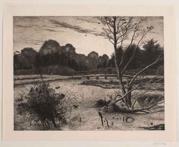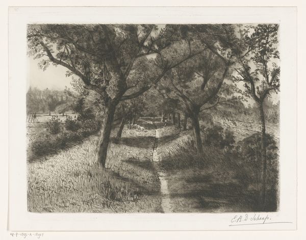 Egbert Rubertus Derk Schaap created this artwork titled 'Gezicht door bomen op een hooischuur' with charcoal on paper. At first glance, the drawing presents a study in contrasts. The composition, predominantly monochromatic, stages a play between dense, dark foreground elements and a lighter, more open background. Schaap uses the charcoal medium to evoke a sense of depth and texture, particularly in the detailed rendering of the foliage. The arrangement of the trees acts as a natural frame, drawing the eye towards the subtle presence of the hay barn in the distance. This formal structure might remind us of Ferdinand de Saussure's concept of structuralism. The artwork becomes a system of signs. For example, the trees in the foreground act as signifiers, pointing to the signified, which is the tranquil rural scene beyond. Through the formal interplay of light, shadow, and compositional elements, Schaap invites the viewer to decode the landscape. The charcoal, used to render the scene, thus becomes a medium not just of representation but of philosophical inquiry.