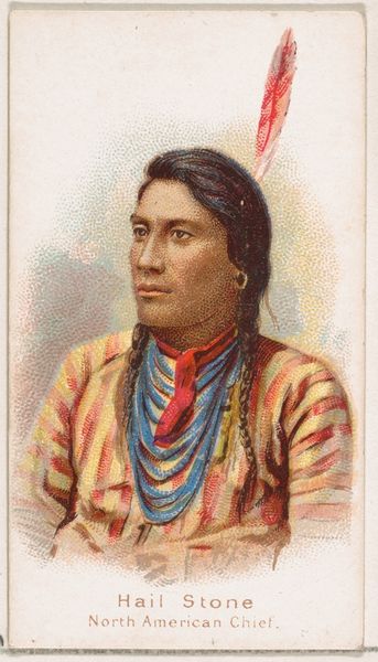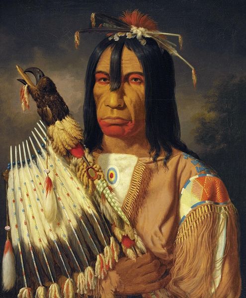 George Catlin painted this portrait of Há-tchoo-túc-knee, or Snapping Turtle, using oil on canvas. Catlin was known for his portraits of Native Americans, and the material qualities of oil paint play a crucial role in how we interpret this work. The smooth, almost idealized rendering of Snapping Turtle’s face contrasts sharply with the more loosely painted clothing, adorned with what seems to be imported fabric and trim. This difference in texture and detail is quite telling. Catlin's technique seems to highlight a tension between the sitter's identity and the encroaching influence of Western goods and culture. The artist has carefully depicted the textures and patterns of the clothing, suggesting their value as trade items or symbols of status. The very act of painting with oil, a European medium, further underscores this cultural exchange. Ultimately, the portrait invites us to consider the complex interplay between representation, cultural encounter, and the material realities of a changing world. It encourages us to move beyond conventional distinctions between art and ethnography, or painting and craft.