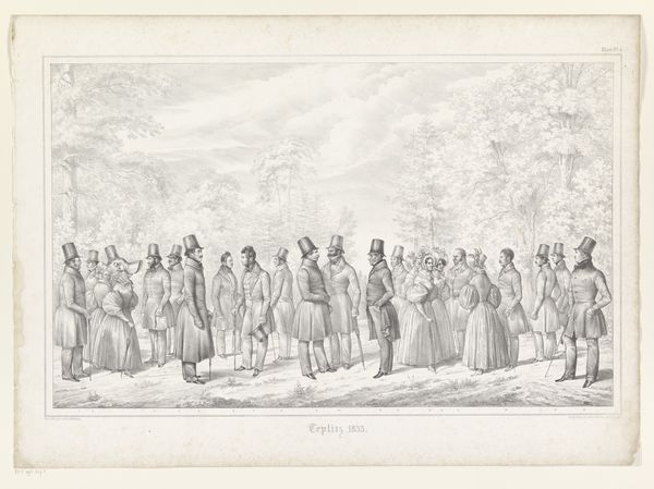 Editor: This print, "Maskerade door studenten van de Leidse Hogeschool, 1840" by Jacobus Ludovicus Cornet, presents an intriguing procession of figures. It’s rendered in engraving. What strikes me is the emphasis on social display, a kind of performance of status. What's your take? Curator: The work speaks volumes about social hierarchies and identity. Look at the specificity in the clothing. What does their attire communicate about gender and social standing in the 1840s? Editor: I see distinct variations, like some students wear elaborate tunics while others are in more austere robes, almost like clerical garments. How might this ‘masquerade’ relate to academic and societal power dynamics? Curator: Precisely. Consider how the ‘masquerade’ blurs lines yet reinforces certain power structures. Costume, even in playful contexts, becomes a potent signifier. How might these visuals perpetuate or challenge societal norms around academic identity and privilege? Editor: Perhaps the masquerade, in its seeming freedom, highlights how thoroughly individuals are coded by their outward appearance. I didn’t expect a simple class portrayal to contain such critical depth! Curator: And note the very specific 'Leidse Hogeschool.' This allows us to interpret these depictions as being actively constitutive of an elite identity connected to that particular educational institution. Editor: That clarifies how even seemingly descriptive depictions can actively reinforce societal structures! I appreciate learning how prints like this served as ideological instruments during that period. Curator: Exactly! Every visual choice in art, even the seemingly innocent ones, can perpetuate ideologies. Engaging with historical and social contexts allows us to decode such potent messages and critically reflect on our world.