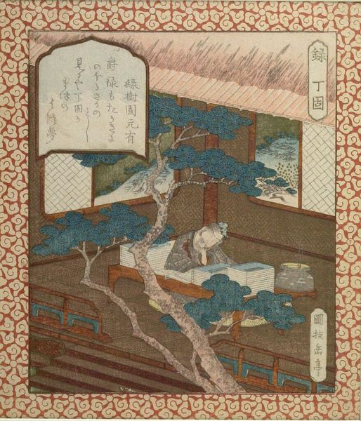 Editor: This is "Chinese Woman Examining Spider Web in Box" by Yashima Gakutei. The print, on paper, shows a woman peering into a box. It's an intimate scene, but the poems suggest a public element. What's its historical context? Curator: The presence of poems alongside the image transforms it into a social object, a collaborative artwork meant for shared appreciation. The act of examining the spider web might be a metaphor for observing societal structures, or even the fragility of life itself. Editor: So, the poems aren't just decorative? Curator: No, they actively participate in constructing meaning, reflecting contemporary values and aesthetic preferences. The spider web, often a symbol of intricacy and deception, gains new layers of interpretation through these textual additions. How does that shift your understanding? Editor: I see it less as a private moment, and more as a commentary on the observer's role within a larger social framework. Thanks!