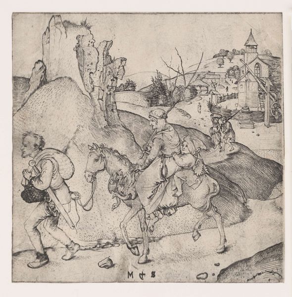 Martin Schongauer created this engraving, “Peasant Family Going to Market,” sometime in the late fifteenth century. Schongauer lived in Colmar, a wealthy town in the Alsace region and, though little is known about him, he likely came from a family of goldsmiths. The print depicts a family on their way to the market. The mother and child ride the horse, while the father walks, weighed down by burdens, including what looks like a sword. The family appears to be making their way from a rural area to what looks like a busy town. Consider what it might have been like to live in this agrarian society, where roles were rigidly defined by gender and class. What did it mean for the man to carry the sword? Was this for his protection, or did it signal something about his status? Schongauer’s delicate lines are a testament to his mastery, capturing a moment in time that reflects both the hardships and the simple rhythms of life for peasant families.
