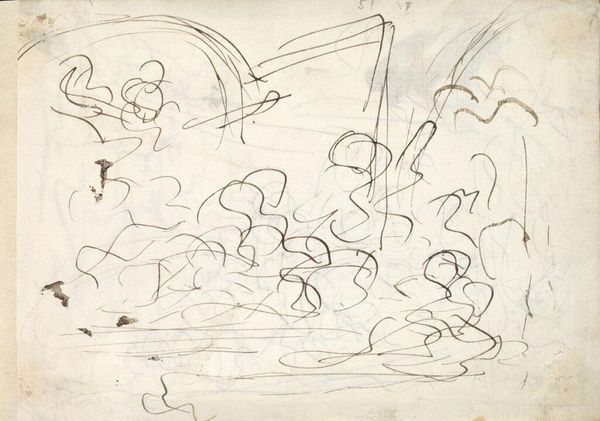 Curator: This small work at the Harvard Art Museums is titled "Composition Study" by Jean-Honoré Fragonard. Editor: My first impression is chaotic. The ink seems applied quickly, with a nervous energy. Curator: Absolutely. Considering Fragonard's historical context—the pre-Revolutionary French court—it's fascinating to view this as a raw expression, almost a rebellion against the rigid social structures. Editor: Indeed. The materiality of the ink and paper are central to this reading; they allow for the rapid execution, a sort of freedom not permitted in larger, more formal works. How was paper used at this time? Curator: Paper in pre-Revolutionary France was increasingly available but also tied to social status. Fragonard's access speaks volumes about his position and artistic freedom. Editor: It certainly seems that this study offered him a space, perhaps a personal one, to explore his craft, challenging the constraints of his time. Curator: Thinking about the artist and materials within a social hierarchy like this gives me a better understanding of this work's context. Editor: And for me, seeing the quick gestures allows me to think about the labor that went into Fragonard's artistic production, both in terms of his technique and the accessibility of materials.