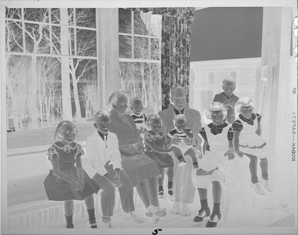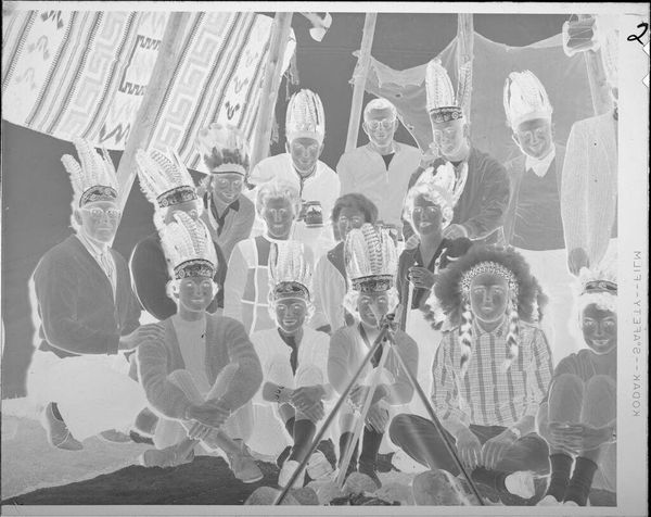 Curator: Looking at this work—an untitled photograph by John Deusing—I'm immediately struck by the eerie, almost spectral quality. The group in costume appears as ghostly figures. Editor: Yes, and it seems important to examine these costumes and the potential narratives they represent. Who are these people, and what statements are they making through their chosen attire? Curator: The historical context is key. Group portraits like this often served as records of social organizations or events. I wonder what role this particular group played in its community. Editor: Exactly! The image hints at performance, ritual, perhaps even a subtle form of social commentary embedded within the costumes themselves. We must consider the power dynamics at play. Curator: It's a snapshot of a moment, frozen in time. The stark lighting adds to the sense of formality, but also a strange kind of vulnerability, don't you think? Editor: I agree. It raises crucial questions about identity, representation, and the performance of self. I leave with a sense of intrigue and the unsettling feeling that there is so much more beneath the surface. Curator: I agree; there's a story begging to be uncovered behind each masked face.
