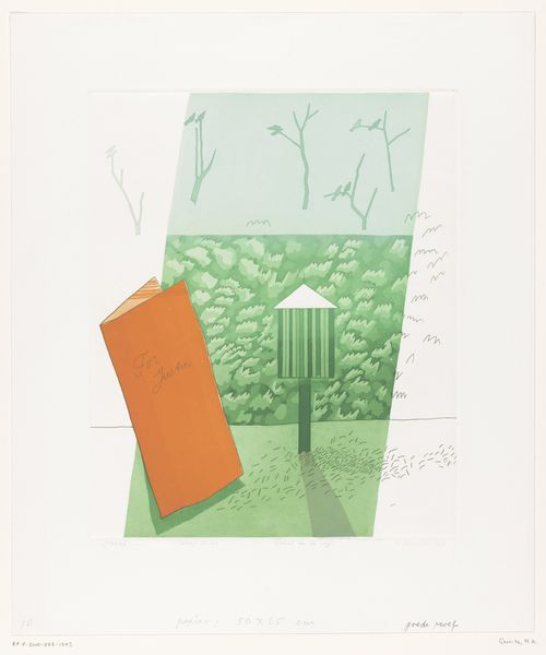 Editor: Here we have Harrie Gerritz's "Bericht van de regenmoeder" – "Message from the Rain Mother," made between 1950 and 2009. It's a linocut print that feels surprisingly playful given the title. The geometric forms are arranged in a way that feels almost like a visual poem. What do you make of its symbolism? Curator: Oh, a visual poem is spot on! It tickles my brain in delightful ways. The Rain Mother… I imagine her less as a figure of stormy wrath, and more as a gentle giver of life. The figure diving into those angled lines of rain, are they surrendering, or gifting life? It reminds me a bit of early modernist experimentation with abstraction – thinking about how Joan Miró or Paul Klee may have interpreted ancient myths. It plays with the flattening of perspective... but in a light-hearted way. Editor: That's a wonderful point. It is like a dreamscape rather than a realistic scene. What do you mean by the 'flattening of perspective'? Curator: Well, think about it: we have the figure at the top, the celestial forms beside it, the rectangle and the abstracted land at the bottom. There's no sense of spatial recession as you’d get in Renaissance art; everything's on the same plane, inviting you to move around the image and connect with each symbol on its own terms. It makes me wonder, is it 'raining' down to the land, or is it rising back up? Editor: That's a cool way to look at it, I was stuck in my interpretation. So, do you think the extended production period is significant? Does this suggest anything about the evolution of the work? Curator: Good eye! That long period makes me wonder about the artist’s relationship to the piece. Perhaps it was a work he kept returning to, reinterpreting his initial vision over time as his artistic language evolved. The Rain Mother, sending messages across decades... What better metaphor could there be for art itself? Editor: Exactly. This makes me appreciate that things aren’t always what they seem. Thanks for broadening my perspective. Curator: And thank you! I’ll certainly think differently next time rain pours, seeing gifts rise upwards too!