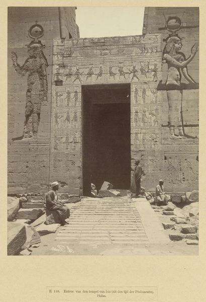 Curator: Look at this gelatin silver print from before 1862, titled "Doorgang in het tempelcomplex van Medinet Haboe." It’s the work of Francis Frith, and it’s currently held at the Rijksmuseum. Editor: It feels so incredibly weighty. The sheer density of the stone and those imposing hieroglyphs give a real sense of enduring power. The monochrome also brings this palpable feel to the image. Curator: Absolutely. Frith has captured more than just the architecture; he’s documented a fragment of a civilization. Those carvings… the narratives, the rituals they embody – they speak of a complex society that saw the world through a vastly different symbolic lens. Editor: And seeing it through Frith’s lens raises interesting questions about the Western gaze on Egypt in the 19th century. How complicit was early photography in exoticizing and appropriating ancient cultures? We must think about colonialism. This isn't just a picture of a ruin. It’s a record of cultural interaction and possibly of an imbalance of power. Curator: That's a critical point. But even within that context, I can’t help but feel a sense of wonder at the repetition of forms. Consider how particular shapes, repeated and standardized, act as vessels for deeply encoded concepts and values of Ancient Egypt. We can find the continuity through visual culture in Ancient Egypt, but only from this representation through an image, and only when filtered through Frith’s work and gaze. Editor: Wonder, but also responsibility. We need to acknowledge how access to these images has been unequally distributed and how the stories told about them have often served very specific ideological interests. We can’t let our awe blind us to that history of exploitation. Who owned the ability to document these cultures? And how was that power used? Curator: It is powerful to see how this photograph holds cultural memory across millennia – reminding us both of humanity’s ability to create enduring forms and the responsibility we share in interpreting them thoughtfully and critically. Editor: Indeed. And that dialogue between aesthetics, ethics, and historical awareness is, perhaps, the most enduring impression left by Frith's photograph.