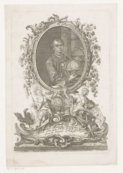 Curator: We're looking at "Portret van Joseph Oriol," an engraving made sometime between 1731 and 1788, credited to Johann Esaias Nilson. It’s currently held here at the Rijksmuseum. Editor: My first impression is one of intense piety, almost theatrical in its presentation. The ornate frame and the cherubic figures contrast sharply with the rather somber portrait itself. Curator: Exactly. Baroque portraiture often utilized symbolic imagery to convey status and character. Oriol is depicted in an oval frame, a format reminiscent of religious icons and commemorative medallions, nestled amidst symbols of divinity and faith. Editor: Note the placement of the crucifix to his right – strategically placed in the scene’s composition. This recurring motif of the crucifix in proximity with learned individuals can act as an emblem, suggesting not just piety, but perhaps devotion to theological teachings or spiritual doctrine. What social and religious movements do we see influencing these iconographic symbols? Curator: Considering the socio-political context, Oriol was canonized as a Saint in 1909, solidifying a historical and social need for symbols of good will and divine influence during times of social strife. He has since represented hope and recovery within the communities. The original engraved print perhaps aided to propel him to the spotlight to further galvanize social progress in Barcelona, for example. Editor: I am struck by how even in the cherubs at the bottom, we have differing, recognizable presentations of angels. Do we see in Baroque art these figures also start to act as symbols for larger social phenomena that started influencing artistic visual depiction? Curator: That’s an intriguing interpretation! It’s not just a portrait of an individual, but also an indicator of the burgeoning canonization movement, illustrating the complexities of history, social change, and individual perception within a politically charged atmosphere. Editor: Indeed. The weight of religious symbolism and the context in which those symbols are consumed shapes the lasting resonance of this portrait. Curator: Thank you for that insightful iconographic analysis. I'm now looking at it in a different light, seeing beyond the immediate reverence to understanding the interwoven historical currents.