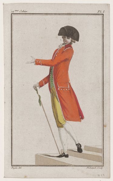 This print, titled "Le Départ de Calicot Pour le Combat," was made anonymously in the early 19th century using etching and hand-coloring. Its social commentary is built into the very fabric – or rather, the *calico* – of its making. The title itself is a play on words: "calicot" referring not just to the fabric, but also to a foppish shop assistant. The print likely satirizes the bourgeois aspirations of the time, with the figure's exaggerated attire hinting at the excesses of a society fueled by trade and expanding markets. The etching process, involving acid to create lines on a metal plate, allows for the mass production of images. Hand-coloring, on the other hand, adds a layer of individual labor, complicating the relationship between industrialization and artisanal work. This tension mirrors the societal shifts of the era, where traditional crafts were increasingly challenged by mechanized production. Considering materials, making, and context helps us understand the intricate layers of meaning embedded in this seemingly simple print, challenging the traditional boundaries of art history.
