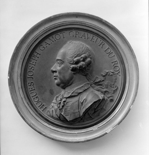 Curator: Before us we have Jean-Baptiste Nini's terracotta roundel, dating to 1763, currently residing at The Metropolitan Museum. The piece is entitled "Portrait of a man, possibly the Marquis de Riancey." Editor: My initial reaction is one of quiet stateliness. It’s not imposing, but there’s a definite sense of dignified reserve in that profile. It's striking how a material like terracotta can convey such refinement, more often we think of bronze for sculpture portraits of nobles. Curator: Indeed. The profile portrait, deeply rooted in ancient Roman imperial imagery, saw a massive resurgence during the Neoclassical era, and here, it perfectly captures the Marquis's supposed persona. He becomes an almost allegorical figure, embodying the ideals of the Enlightenment. The sharp line of the nose is very Roman too. Editor: I’m more struck by Nini’s deft handling of the material itself. Look at the texture he coaxes from the terracotta—the subtle variations in tone that mimic the light catching on fabric. How was this medallion even created? What molds, what labor? That information speaks volumes about the industrial nature of art production during this period. Was this a unique cast, or mass-produced? How accessible would such a likeness be to ordinary people, or common households? Curator: Intriguing points! I see the piece operating on a more symbolic level. The subject's gaze fixed forward—his unwavering focus represents progress and reason, which are central tenets of Neoclassical thought. The slight upward tilt of the head suggests confidence, leadership, and a commitment to enlightened principles. But of course, what you say of labor informs the price point, and therefor the distribution among households of varied status. Editor: And, of course, the physical act of making it speaks volumes about Nini's technical skill. Terracotta may seem like an "everyday" material, but manipulating it to achieve such detail requires a mastery of process, an artisanal skill. Even in an age increasingly defined by rationalism, the artist's hand remains central to the creation of meaning. The metal frame too, how was this created, attached and by whom? Curator: I find myself seeing this portrait as an assertion of Enlightenment ideals, frozen in time, while you explore how these concepts manifest through physical craft. Editor: Exactly. Art's dialogue extends beyond its aesthetic qualities; it's intrinsically linked to its own making.