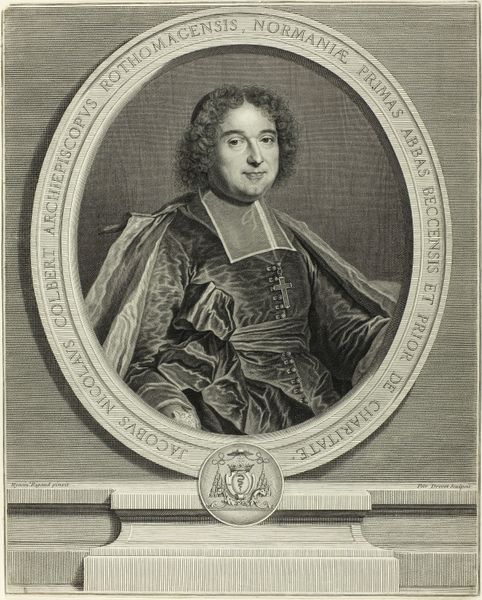 This is Pieter van Schuppen’s “Portret van Pierre de Bonzi," an engraving on paper, now held at the Rijksmuseum. The portrait presents a study in contrasts, framed within a rigid oval that seeks to contain the subject's voluminous wig and corpulent presence. Schuppen employs a dense network of fine lines to construct form and texture, creating subtle gradations of light and shadow. This technique is evident in the rendering of Bonzi’s face, where the artist captures a sense of weight and gravity. The strategic use of framing devices, like the simulated stone windowsill upon which Bonzi’s titles are inscribed, further enhances the structured quality of the piece. Yet, the portrait also plays with the codes of representation and power. Note the elaborate insignia that suggests status, and the sitter’s gaze, which projects both authority and a hint of vulnerability. The visual elements invite us to explore the relationship between the individual and the societal structures they inhabit. It’s a reflection on the construction of identity through visual signs.