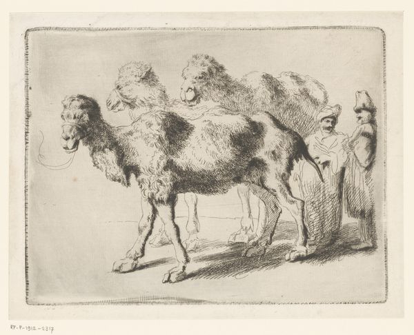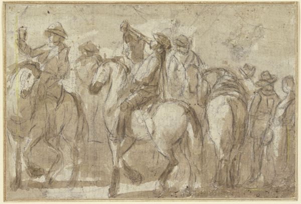 Curator: Standing before us is Francesco Allegrini's "Horsemen and Archers," an ink drawing believed to have been created sometime between 1624 and 1663. It resides here at the Metropolitan Museum of Art. Editor: My immediate impression is one of spirited, yet slightly unresolved energy. The figures feel like a fleeting moment captured in ink; light and quick, it nearly escapes the page. Curator: That aligns with its potential function as a preparatory sketch, a study for a larger, more definitive composition. Allegri's Baroque style is on display here, evident in the dramatic positioning and sense of movement. Consider the historical context of such battle imagery and the culture it both reinforced and questioned. Editor: The lines are incredibly expressive, aren't they? Look at how he uses the varying line weights to suggest form and shadow. And observe the dynamism in the posture of the archers versus the mounted horsemen, lending visual tension to the scene. Curator: Such scenes spoke volumes about power, authority, and military prowess. Images like these served as propaganda but were equally a commodity. Their creation, circulation and consumption depended heavily on powerful families like the Borghese family or the Medici’s courts that propelled artist careers. Editor: While the social and political considerations shape meaning of this work, I find myself coming back to the sheer artistry in representing motion. The way the artist captured the stride of the horses, or even just a feather detail in a rider's helmet is extraordinary. Curator: Precisely, we are balancing the power and prestige associated with those portrayed here and the reality of life lived under such systems. Editor: I now recognize the merit in investigating the deeper historical narratives that are captured in the work. I began admiring only its intrinsic, formal elements, but appreciate the interplay between image-making and societal influence. Curator: And perhaps I initially downplayed the remarkable artistic skill for historical understanding. What a productive journey of discovery.
