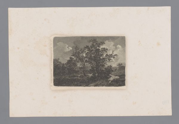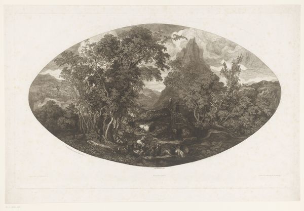 Editor: This is "Travelers in a Night Landscape" by Carl August Lebschee, an etching made around 1827. The high contrast and the strong moonlight give it an almost theatrical quality, and those travelers look like they're in for a rough journey. What strikes you about this print? Curator: I'm drawn to the romantic portrayal of nature, of course, but it makes me think about who gets to travel safely, and who is forced to travel at night. Lebschee created this during a time of immense social upheaval, of increasing urbanization that drove rural displacement and class division, so in what ways are these themes being evoked through his chosen imagery? What stories might these people carry, and are they traveling by choice, or by necessity? Editor: That's something I hadn't considered. I was mostly focusing on the aesthetic of the Romantic landscape. Curator: It's a stunning composition, absolutely. But let’s push beyond the purely aesthetic response. Romanticism can glorify a certain vision of nature while ignoring its role in maintaining social inequalities, particularly who gets to experience its beauty without facing exploitation. How does this nocturnal journey relate to ideas of forced migration or the precarity of travel for marginalized groups throughout history and even now? Editor: I see what you mean. The landscape isn't just beautiful, it also looks menacing. They are vulnerable to the elements and potentially to other people. Curator: Exactly! The artistic representation highlights human struggles. Art isn't separate from historical and social struggles; instead, it holds the opportunity to reflect those conditions back to us so we can learn and perhaps inspire others towards justice and freedom. What do you make of the size? Does the miniature nature impact our experience, our interpretation? Editor: The size could speak to the marginalization of their stories... I guess it makes sense; even landscapes have a history rooted in power. Thank you for making me see this from such a different perspective. Curator: It’s a crucial part of engaging with any piece of art. I feel it's vital to discuss history, gender, and power together to form our interpretations.