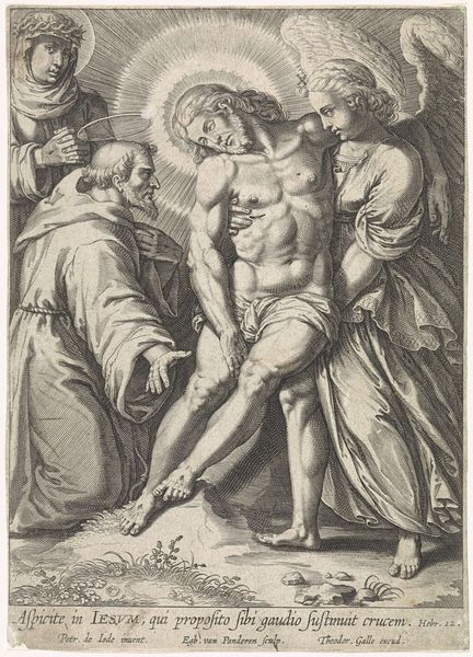 Editor: Here we have Jacques Callot's "Body of Christ Supported by the Virgin and Saint John" housed here at Harvard Art Museums. It’s a somber scene, rendered with such fine lines. What strikes you most about this piece? Curator: It whispers of profound grief, doesn't it? The crosshatching almost feels like a veil of tears. What truly captivates me is how Callot manages to convey such raw emotion with such meticulous detail. Almost as if, by rendering pain so precisely, he's trying to understand it. What do you make of the architectural setting? Editor: It feels like a stage, almost artificial. I wonder if that was intentional, to highlight the drama. Curator: Precisely! And perhaps to frame the figures, as if they were relics themselves. It adds to the sense of timelessness, don't you think? It's a heartbreaking tableau. I shall carry it within me now. Editor: I completely agree; it does encourage contemplation. Thanks, I noticed so much more now.