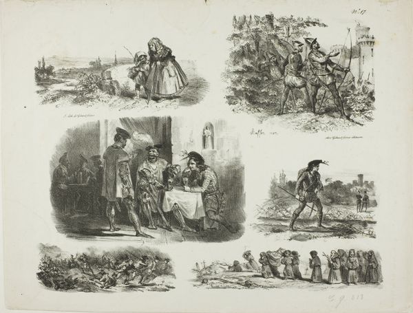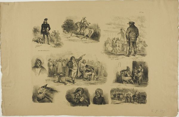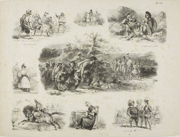 Curator: This engraving, titled "Soldaten-leven / Negentiende eeuw," or "Soldier's Life / Nineteenth Century," offers glimpses into military existence from around 1843 to 1920, attributed to J.J. Camphausen. It's striking, isn't it? What’s your first take? Editor: Immediate impression? A melancholic storyboard. Little vignettes hinting at grand, sweeping narratives of conflict. It feels more like a shadow play than a celebration of martial prowess. Curator: I think that reading of it as a "shadow play" is very astute, actually. Notice how the artist arranges scenes depicting moments of active battle alongside quiet, contemplative moments. Editor: Absolutely, look at the scene with Napoleon – such isolation! Even the ones depicting apparent victory or readiness, there's a heavy sense of somber anticipation. Almost as though Camphausen is inviting us to contemplate the personal cost of those historical moments. Curator: Precisely! It is genre painting with an historical aspect rooted in Romanticism. The juxtaposition hints at something deeper—the cultural memory and the soldier as a perpetual figure within the framework of the grand scope of history itself. Note too how his stance is repeated by some of the other individual figures throughout. Editor: A stoic figure, carrying the weight. The endless cycle. This composite feels timeless despite its explicit timeframe, doesn’t it? I wonder if Camphausen intentionally set out to create this effect by compressing different aspects of war onto a single page? It is like time is folded in. Curator: Exactly! This piece isn’t simply about battles; it's about soldiering and it invites reflection upon the individual caught within larger political narratives, especially for those living in Europe in that era. The personal is small but not minimized as the historical frame is suggested through a sense of shared memory. Editor: That’s well said, really. It makes you question not only what’s being depicted, but how the individual soldiers themselves might feel in these various scenes. Curator: Indeed, a powerful convergence of form and emotion—visual poetry in grayscale! I feel as though the frame enhances this feeling that history might be more cyclical than linear. Editor: Absolutely, leaving you to consider where, or even when, the viewer fits within these reflections! Thank you for bringing such illuminating contextual and symbolic readings to this beautiful, haunting work.
