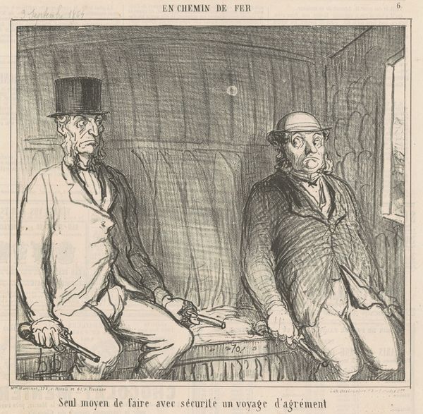 Curator: This lithograph by Honoré Daumier, titled "The Only Way to Share a Compartment with Safety," feels charged with unease, doesn't it? The two figures, clutching pistols, radiate suspicion. Editor: Absolutely. Look at how Daumier renders the scene, probably on stone. The frenetic hatching suggesting unease, fear of others, and a bit of class tension. Curator: Exactly. The rough lines, the contrast between light and shadow—it speaks to the anxiety of travel and the perceived need for self-defense. Editor: And that self-defense is commodified, accessible, perhaps even necessary for bourgeois comfort. Curator: There's a sad irony to that, isn't there? Wanting to travel in safety while embodying the very fear and suspicion that makes it seem necessary. Editor: The print is speaking to the consumption and social conditions of France in the mid-19th century. Travel isn’t just about seeing something new, it's about material culture. Curator: Well, however you read it, it is a fascinating snapshot of a society grappling with progress and paranoia. Editor: Indeed, it is a potent image of the anxieties inherent in modern life and materiality.