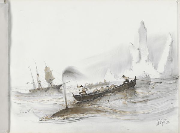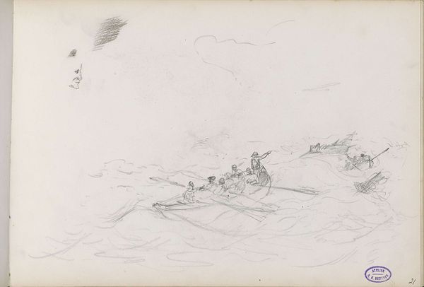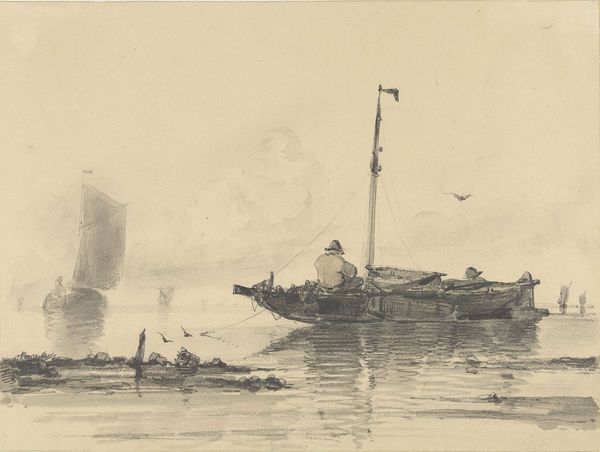 Albertus van Beest created this graphite drawing of a rowboat with figures near a two-master, sometime in the mid-19th century. Van Beest, working during a time of extensive global trade and exploration, invites us to consider themes of labor, travel, and cultural exchange. Look closely at the figures populating the rowboat; their postures suggest a collective effort, a shared purpose in navigating the waters. Who are these people, and what journeys are they undertaking? Perhaps they are merchants, sailors, or even migrants seeking new opportunities across the sea. The drawing subtly touches on issues of class and social hierarchy. We might consider how the figures in the rowboat relate to the larger ship and the individual atop the distant cliff, each representing different positions within the social landscape. Van Beest captures a moment in time that holds both individual stories and broader historical forces.