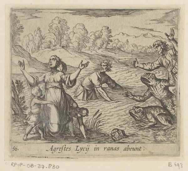 Francesco Villamena created this engraving, "Adam and Eve after the Fall," around the turn of the 17th century. The stark contrast of light and shadow immediately captures our attention, casting a somber mood over the scene. Linear precision defines the figures, while the landscape is marked with dense, cross-hatched lines which describe the texture and materiality of the figures within their environment. The composition is structured around two distinct halves. On the left, Eve is surrounded by her children and a dog. The right side of the engraving presents Adam, isolated, burdened with the toil of labor. This division underscores the shift from paradisiacal harmony to a world of struggle, reflecting a structural opposition. Villamena's stark style, combined with the narrative elements, conveys the postlapsarian themes of guilt, labor, and the loss of innocence. The formal arrangement emphasizes the disruption of an original wholeness. This engraving serves as an important signifier of humanity’s transition into a world defined by binary oppositions and moral struggle.