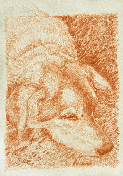 Julie Bell made this drawing, "Her Eyes," using colored pencil on paper. The earthy color of the pencil gives a warmth and approachability to the image, perfectly capturing the kind gaze of this dog. Looking closely, you can see the fine hatching of lines that build up the dog’s form. The artist hasn't blended the colors at all, allowing each stroke to remain visible and contribute to the overall texture. The choice of paper also plays a crucial role, its slightly rough surface catching the pigment and adding to the drawing's tactile quality. The labor invested in this piece is evident in the precision and control of the pencil work. While seemingly simple, the artist's skill lies in conveying depth and emotion through minimal means. This elevation of everyday materials and skilled handwork challenges traditional hierarchies within the art world, inviting us to appreciate the beauty and expressiveness of craft-based practices.
