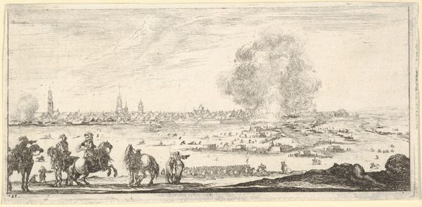 Editor: So this is Stefano della Bella's "Plate 3: a procession of horse-drawn cannons" created around 1635 to 1645 using pen, ink, and engraving. It feels like a document, illustrating war, not romanticizing it. What strikes you about it? Curator: Considering the date, I immediately think about the material cost involved. Pen and ink were relatively accessible, of course, but the engraving process indicates a desire for reproducibility, for distribution. It’s about disseminating information about military technology. Editor: So, you see it less as art for art’s sake and more about…military strategy? Curator: Not just strategy, but the industrial aspect of war. Look at the meticulous detail on the cannons. Della Bella isn’t just depicting war; he's cataloging the tools and infrastructure of early modern conflict. What was the process of obtaining the horses? Who managed the gunpowder production? Editor: I guess I hadn't considered the logistics, just the grand scene. The labor involved must have been extensive. How does viewing it this way change how we perceive it? Curator: It forces us to confront the human element within the machine of war. We are not just looking at some heroic representation, but the fruits of labor, resources, and social structures needed for cannons and horses to move across a battlefield. The landscape almost becomes a backdrop for examining this machine and its operators. Editor: That makes me see the image in a whole new light. I appreciate your perspective! Curator: And I, yours. Seeing this from a compositional viewpoint reminds me to step away from materials sometimes and notice structure. Thank you.