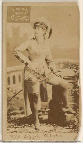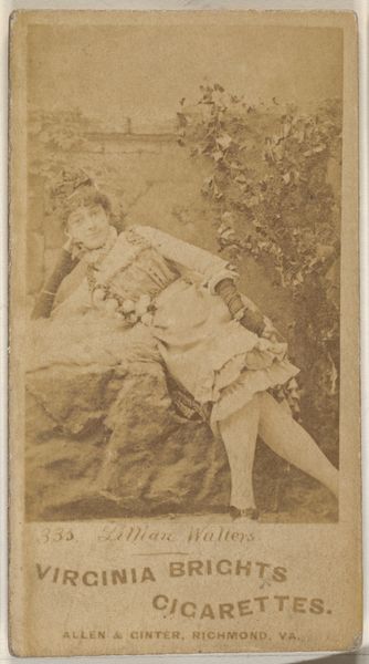 Editor: This is "From the Actors and Actresses series (N45, Type 5) for Virginia Brights Cigarettes" dating from between 1885 and 1891, created by Allen & Ginter. It looks like a photograph, almost a drawing too, sepia-toned and capturing a woman in what appears to be theatrical costume. Given the advertisement at the bottom, I suppose it was designed for distribution as a small print or card. It makes me think of the theatrical productions of the time. What strikes you most about this image? Curator: The cigarette card! A seemingly ephemeral object actually teeming with cultural information. These cards were enormously popular; mass-produced collectibles inserted into cigarette packs, revealing much about the period's ideals and aspirations. Who was included and how? Which brands circulated particular imagery? Think about what roles were deemed "desirable" enough to sell tobacco! Why portray actresses in this way? Is it promoting ideas of gender, class, and nationality? Editor: That is really interesting; I hadn’t considered the choices behind who got depicted. Do you know what made someone "card-worthy?" Curator: Popularity, certainly. But also conformity to specific ideals. In this case, think about how she's posed, how she is costumed, and even how her likeness has been captured. There were many ways that Allen & Ginter tried to speak to what its customers wanted to believe and how they liked to visualize things. Even the printing technology plays a part in conveying that idea. Editor: It's amazing how something so small could contain such complex cultural messages! Thanks, I hadn’t thought about cigarette cards in this much depth before. Curator: Me neither, until this moment. Thank you for helping me think about it from another angle.