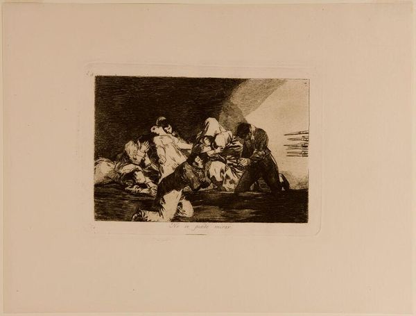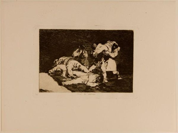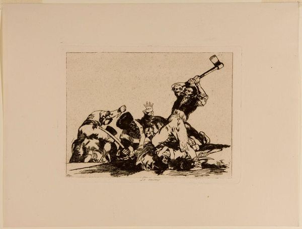 Editor: This etching, titled "Why?" is by Francisco José de Goya y Lucientes. The scene is unsettling; violence seems imminent. What's your take? Curator: Goya's series, "The Disasters of War," relentlessly critiques power. The vulnerable figure pinned against the tree becomes a symbol of the voiceless victims of conflict. Consider the composition: the armed figures are sharply defined, while their victim dissolves into the shadows. Editor: So, it's a commentary on the dehumanizing aspects of war? Curator: Precisely. Goya challenges us to confront the uncomfortable truths about domination and the suffering it inflicts, reminding us that these power dynamics persist. Editor: I never thought of it that way. Thanks! Curator: It's a potent piece for prompting critical reflection on contemporary issues.