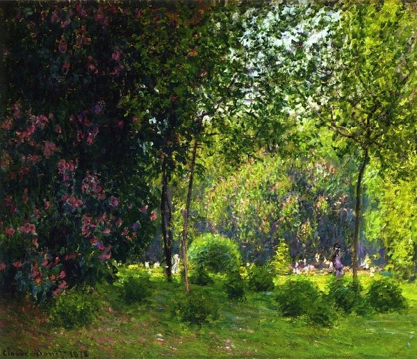 Editor: We're looking at "Poplars, Éragny," painted by Camille Pissarro in 1895. It’s an oil on canvas, and it’s currently hanging here at the Metropolitan Museum of Art. It has a dreamy feel to it. So much green! It almost feels like the painting is vibrating because of all the broken brushstrokes. What stands out to you about the composition? Curator: The density and arrangement of brushstrokes. Note how Pissarro deploys shorter, broken touches in the foreground field, building a tactile surface alive with reflected light. Now, compare this to the treatment of the foliage. What differences do you observe? Editor: The trees are made up of much softer strokes...it makes them seem sort of feathery compared to the almost prickly ground! Is that contrast intentional, or am I just imagining it? Curator: Indeed. Observe how the chromatic scale shifts as we move upward. Lower, warmer greens and yellows yield to cooler blues and grays higher in the canvas. The sky, visible through the trees, isn't simply blue; it's a textured field of interwoven hues. Do you agree this chromatic organization contribute to spatial recession within the pictorial field? Editor: Absolutely! It's easy to miss that detail if you’re not paying close attention, but it completely makes sense when you consider how the eye perceives depth. The painting would be flat otherwise. Thanks for pointing out something so obvious! Curator: It is through such meticulous analysis that we come to appreciate Pissarro's structural command. The artist directs our gaze through strategic formal relationships. Considering Impressionism valued depicting 'impressions', I argue there is far more rigour in it than one initially assumes. Editor: I completely agree. I definitely came in with some assumptions of my own, which has certainly changed. Looking at it this way has made me consider formal elements in a different light now.