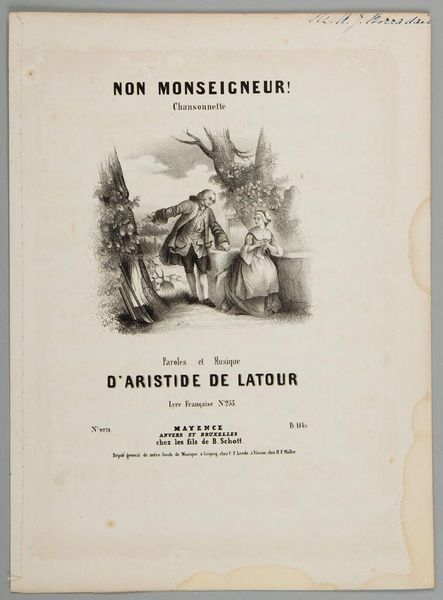 Curator: This lithograph is the cover for sheet music titled "The Masterpiece of the Devil," a ballade. The artist is anonymous, and it resides in the Harvard Art Museums. It strikes me as a rather theatrical composition. What do you think? Editor: It certainly has a strong visual hierarchy, with the figures sharply defined against the stark background. The devil's pose seems carefully staged. Considering it's a cover for sheet music, I wonder about the printing process of these lithographs and the labor involved in producing them for mass consumption. Curator: Indeed. The stark contrast in the image highlights the tension between the devil and the maiden, echoing perhaps the seductive allure of music itself. The semiotic weight of the devil's wings contrasted with her delicate veil is powerful. Editor: I agree. Further, one might consider the distribution networks that enabled this image and the music it advertised to reach a wide audience. Were these images crafted primarily for a bourgeois consumer? Curator: Absolutely. It invites deeper consideration into the cultural milieu of its time. Thanks for pointing that out. Editor: And thank you for illuminating the artistry! It has been a fruitful look into this sheet music cover.