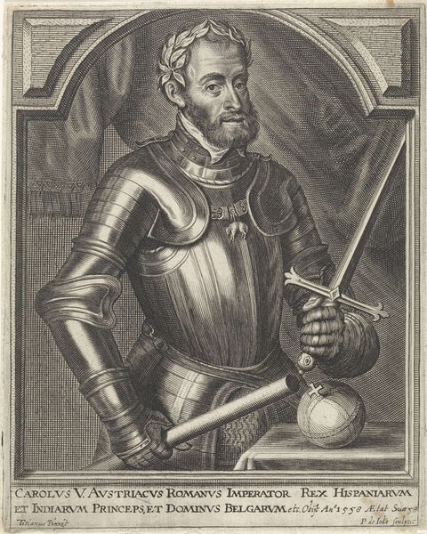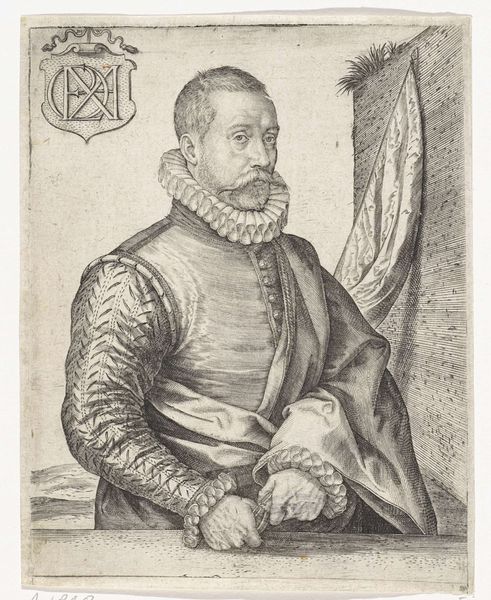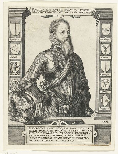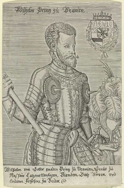 Curator: This print from 1615 by Nicolaes van Geelkercken depicts Willem I, Prince of Orange. What strikes you first about this historical figure's representation? Editor: Well, the detail is incredible for an engraving! It has a very formal, almost stoic feeling. The armor makes him look powerful, but the scene behind him is confusing; what’s going on in that distant hall? Curator: Precisely! The symbols surrounding William aren't just decorative, they narrate a story, and the hall plays a significant part. Do you see how Willem isn't simply presented as a ruler, but as a figure burdened by ongoing conflict, evident in the battle scene depicted? Editor: Yes, it does seem he’s turning away from some sort of chaos… is it significant that the armor and the helmet-on-a-stand take up so much space in the foreground? It almost feels like…preparation. Curator: Exactly! The armor isn't just a symbol of power but perhaps a constant reminder of the battles he is perpetually facing. It's part of his identity but also a heavy weight. Consider, too, that while the main scene is quite rigid, there’s movement depicted behind him. It's a strategic inclusion by van Geelkercken, wouldn’t you agree? Editor: I hadn't thought of it that way, but it definitely adds a layer of complexity. So, it's not just about showcasing Willem as a strong leader, but hinting at the ongoing struggles and the weight of leadership he carries? Curator: Indeed. The symbols aren't static; they are actively participating in a larger narrative, constantly reminding viewers about history and the individual's role within it. I'm interested, do you think this artwork aims more to commemorate Willem I's triumphs or to emphasize the sacrifices inherent in leadership during tumultuous times? Editor: I think you're right, it's a mixture. The engraving honors him, but the symbols of conflict suggest leadership demands continuous sacrifice. It certainly enriches my understanding of this era!