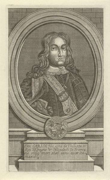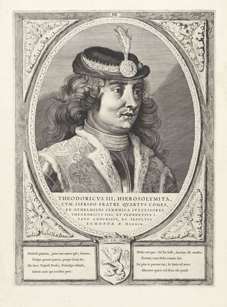 Curator: Welcome to the Rijksmuseum. Here, we see a piece entitled "Portret van Dirk V, graaf van Holland," a work from around 1650 attributed to Cornelis Visscher. It is an engraving. Editor: Hmm, my first impression is that it feels incredibly ornate, almost theatrical. There is so much detail crammed in, like everyone wanted to flaunt their importance through the artwork. Curator: That’s a astute observation, especially considering the era. This portrait needs to be examined within the framework of Dutch Golden Age portraiture, which, as you subtly suggested, was inextricably linked to class and the rising mercantile power structures in Dutch society. Visscher depicts Dirk V, but not in a vacuum; he's asserting status through the visual language of power. Editor: The seriousness of the man almost feels at odds with the playfulness of the surrounding design—all those leaves and flourishes in the border are tickling him or something. Curator: It's precisely that tension which speaks to the complexity of the time. We see an adoption of baroque sensibilities blended with the austerity often associated with Dutch Protestantism. Dirk V is long deceased by 1650; how then should we frame the contemporary implications of Visscher reviving his image and name? How are artists influenced to performatively construct the past to serve social functions in the present? Editor: The artist creates a certain feeling even as he or she is replicating existing tropes of representation, that's an intriguing thought to play with! The starkness of the black and white and the very formal rendering also invite speculation. In a way, I want to make it messy—add a bit of watercolor or a chaotic collage just to shake things up. Curator: Indeed. That response is understandable as a rebellion against established power. Your creative impulses underscore the dynamic between honoring historical representation and actively challenging inherited narratives about power, class, and identity. What do we choose to leave behind? What is worth memorializing, and for whose benefit? Editor: These old portraits are like jumping-off points. Starting with these, how do we go about redefining history from where we stand right now? Curator: An excellent provocation. I invite listeners to continue contemplating how artists and audiences are bound within ever-evolving socio-political dialogues as they move to the next artwork.