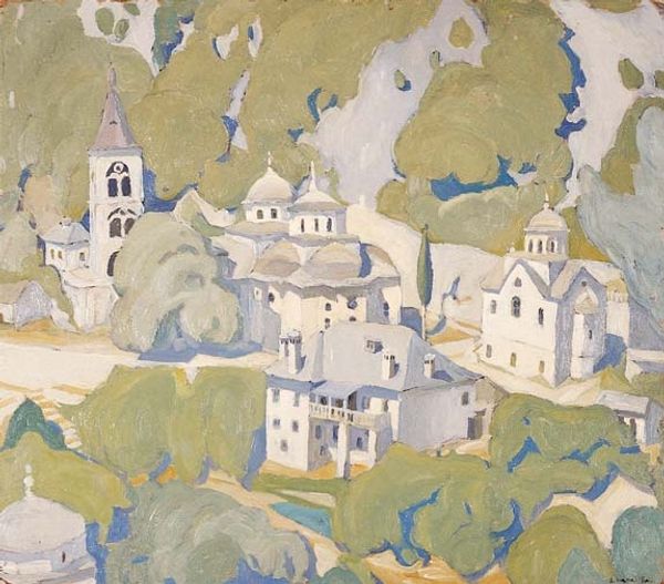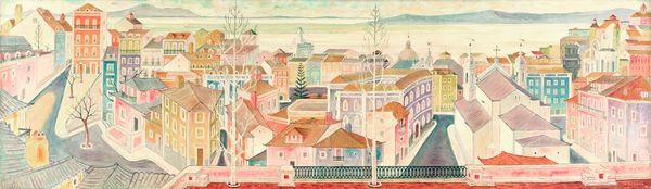 Curator: Carlos Botelho’s 1962 watercolor painting, "Lisbon," offers a captivating perspective on the city. Editor: Immediately I’m struck by the materiality—or rather, the apparent lightness. The watercolor gives everything a delicate, almost faded quality. Curator: Precisely. The medium really captures the city's melancholic beauty, doesn't it? There's this feeling that Lisbon is rising, as if on layers, a delicate layered landscape—but is it real or a half forgotten memory? Editor: Absolutely, the technique emphasizes a sense of lived space and working hands. Look closely, and the individual brushstrokes construct these simplified structures that make up Lisbon, suggesting mass production of living. You feel the repetitive labor implicit in a cityscape’s evolution. Curator: It's amazing how he captures this urban essence using such minimalist lines! Notice also the way the buildings stack—they are so alive and slightly leaning over. They create their own shapes—cubist!—like memories fading into each other. I almost imagine the ghost of voices from old Lisbon seeping from the bricks. Editor: I'm with you—the blocks of color also help in thinking through processes and consumption. How does this architectural past shape present life in Lisbon? Those bare trees draw me in... a clear contrast to urban materiality of buildings, pointing at the relationship between urbanization and our extraction of raw materials... Curator: Good eye—the skeletal trees juxtaposed against the density of the buildings give it that feeling of both beauty and loss at the same time. As if Lisbon breathes. We should recall Botelho’s exploration of Lisbon through painting lasted more than fifty years. You can perceive the artist’s feeling toward the landscape. It makes the city an emotion as well as an observable space. Editor: The rooftops, particularly, fascinate me. The bold blocks of color signal density and maybe scarcity of resources that give the built environment its visual logic. And what about people living here, using these roofs as exterior space or viewpoints of this beautiful cityscape? Curator: A picture is only half the story isn’t it? You make me want to dive right into the Lisbon depicted here and see and hear what is there and feel and think what was felt. Thanks for adding that perspective. Editor: Of course, our material and process matter, it gives the real flavor! Thank you!