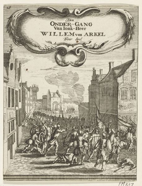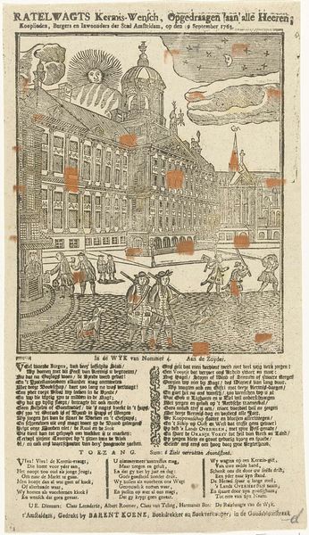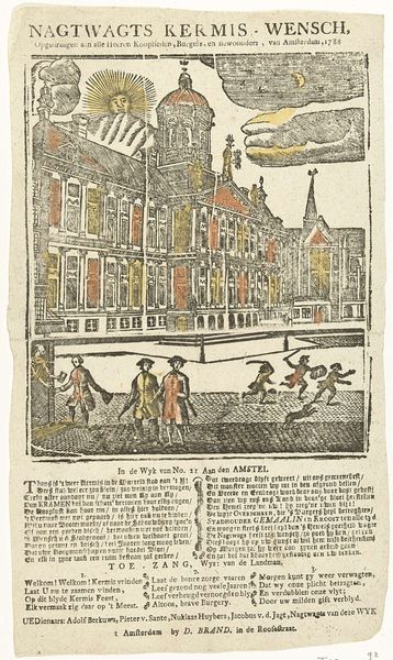 This print, made by Hermanus Numan in 1796, presents a kermisprent—a fair print—of an Amsterdam carter, using etching. Notice how the composition is structured around contrasts. The detailed cityscape in the background clashes with the rough, almost caricatured figures in the foreground. The figures on the left and right, framing the central horse and carriage, are rendered with a stark realism that seems at odds with the idealized backdrop. The interplay between light and shadow accentuates the textures and forms, but also points to a deeper contrast between the festive occasion and the everyday realities of labour. This contrast suggests a questioning of the superficial unity celebrated during the kermis. The text below the image, filled with the language of freedom, equality, and brotherhood, serves as a kind of slogan. However, the visual juxtaposition suggests a more complex relationship between these ideals and the lived experiences of Amsterdam's citizens. The formal dissonance invites reflection on the era's socio-political tensions.