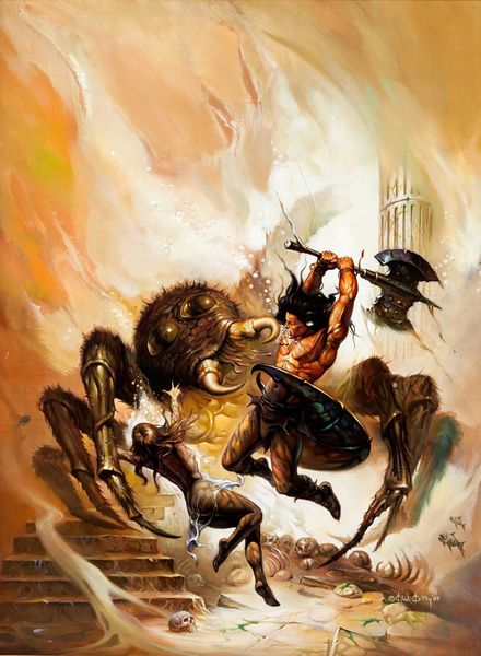 Here we have the paperback cover for The Clan of the Cats, by Ken Kelly, painted with oils. It’s not about perfectly rendering something, it’s about a conversation with the paint, a feeling. The way the oil has been layered in the background gives a sense of depth, almost like looking into a snowstorm. The physicality of the paint is what gets me. You can almost feel the texture of the lion's mane, like a big, furry cloud. And then there’s the way Kelly handled the light on the warrior’s armor. It’s not just about being shiny, it's about how light creates form, how it sculpts the figure. Look at the rendering of the lion’s paw, how it digs into the warrior’s flesh, so real you can feel the tension and threat of the moment. I think of Frank Frazetta, a master of this type of illustration. Both artists share a similar ability to capture dynamic, almost theatrical scenes with strong contrasts. Art's like a conversation, ideas bouncing back and forth across generations, each artist adding their own little twist to the story.