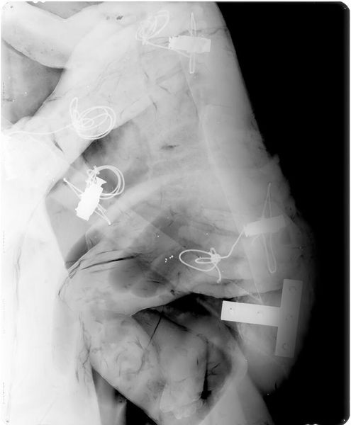Editor: Here we have an X-radiograph of "Two Women," by Jakob Ochtervelt. It's fascinating to see the layers beneath the surface. What does this reveal about the artwork to you? Curator: This image allows us to consider the layers of power dynamics inherent in Ochtervelt's work. The hidden underlayers might reveal adjustments to the figures' poses or clothing, potentially reflecting societal constraints placed upon women, even in representation. Editor: That's interesting. Curator: Yes. It also prompts us to question what is deliberately concealed in art and why. This radiographic view encourages critical engagement. Editor: I never thought about it that way before. Curator: It really brings a new perspective. We can now see this work and its context with deeper understanding. Editor: That's true. Thanks!
