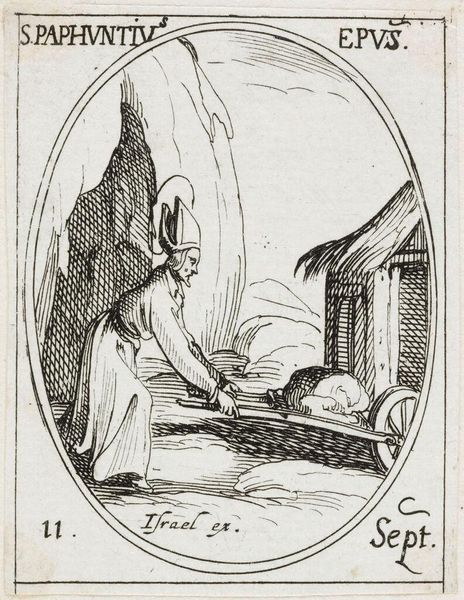 Editor: This is "Saints Perpetua and Felicity" by Jacques Callot. It's a very small print. I'm struck by the ladder going straight up into the sky. What symbols jump out at you? Curator: The ladder, precisely! It evokes Jacob's Ladder, a potent symbol of spiritual ascent, a bridge between earthly suffering and divine grace. Notice the wild beast at its foot; what do you suppose that represents? Editor: Maybe something they had to overcome, like temptation? Curator: Indeed. It signifies the trials, the earthly obstacles, that must be confronted on the path to spiritual enlightenment, a visual metaphor for their martyrdom. Editor: That’s fascinating. So much symbolism packed into such a small space! Curator: It’s a testament to how visual symbols carry layers of meaning, echoing through history.