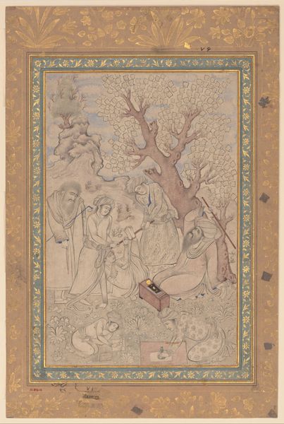 Curator: The artwork before us, created circa 1593 to 1600, is entitled "Tapestry with the Story of Jupiter and Callisto," attributed to François Spiering. It employs weaving and mixed media, characteristic of textile arts from that era. Editor: Oh, immediately, I’m struck by the overwhelming sense of secrecy here. The colors, that deep, muted palette, and the density of figures nestled in the forest. It feels…dangerous, maybe? Curator: Precisely! We're delving into a complex narrative, rendered in visual symbols that carried immense weight. It’s a visual retelling of a segment of the Callisto myth, heavy with implications of betrayal and transformation. Notice how the idyllic landscape cannot conceal the undercurrents of human frailty. Editor: The central group is incredibly captivating, if unsettling. It’s hard to miss the fraught embrace taking place in the heart of the scene—is that Jupiter disguised? The composition really holds the eye there with those twisting forms. Curator: Your intuition serves you well! Yes, that's Jupiter, whose deceit precipitates Callisto's downfall. Beyond its aesthetic appeal, tapestries served as potent political tools and domestic decor. Each woven motif acts as a silent witness, encapsulating prevailing societal views on power and destiny. Editor: Considering how common tapestries were, there's something very profound about elevating storytelling to an everyday art. It’s like an ancient soap opera hanging on the wall, influencing thoughts almost subliminally! Curator: A superb point! The tapestry operates as both a piece of craftsmanship and cultural mirror reflecting societal mores of that era. And bear in mind this piece stems from a Mannerist lens. It distorts naturalism and heightens emotional intensity. Editor: So it’s not merely decoration or narrative, but really, a kind of encoding? A layered communiqué that uses artifice to hint at darker truths. This definitely requires deeper reflection… perhaps in a darker room. Curator: An intriguing note to conclude! The power of images resonates throughout epochs; even simple tapestries offer resonant psychological truths. Editor: Indeed, and I suspect this “simple” tapestry might be telling its secrets long after we depart. A testament to art that can really snag you!