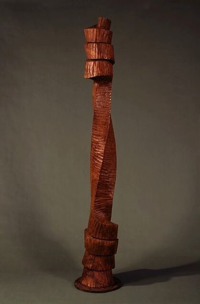This 'Post figure' sculpture, created by Morokodu, presents a compelling exploration of form through its carved wooden structure. The tactile quality of the raw material and the detailed, repetitive carving beckon an emotional and sensory engagement. The artist employs a deliberate composition, stacking geometric and figurative elements. The post is divided into sections of alternating textures: a smooth band of chevrons sits above a field of textured dots, all of which culminate in the smooth dome of the head. This structured organization creates a visual rhythm, inviting contemplation on how the interplay of different textures and patterns shapes our perception. The sculpture challenges fixed meanings by blending abstraction with figurative representation. The face at the sculpture's peak is subtly carved; its smooth shape contrasts with the rough-hewn wooden surface. This contrast isn't just aesthetic. By engaging with the sculpture's semiotic structure, we recognize the artist's manipulation of cultural codes and understand how the artwork destabilizes established meanings, thereby inviting ongoing interpretation.
