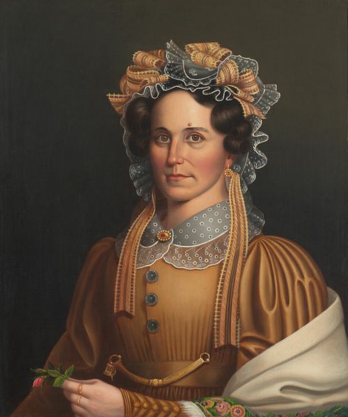 Editor: Here we have Charles Willson Peale's portrait of Mrs. Thomas Ellott, Mary Chase, painted in 1787. It’s an oil painting and the details in her shawl really strike me. What do you see when you look at it? Curator: I am immediately drawn to the textiles depicted, specifically how Peale uses the rendering of fabric – the shawl, the bonnet – to indicate status and domesticity. The labor involved in producing such fine goods, and in their upkeep, speaks volumes about the subject’s place in society. Notice, too, how the key in her hand signifies access and control over the domestic sphere, perhaps even the enslaved people who might have labored within it. How does that reading sit with you? Editor: It's interesting to think about the textiles as a symbol of labor, both hers and others’. The key too, it really drives home the point about class. But the book suggests intellectual pursuits, does that fit in? Curator: Absolutely. The book signifies literacy, education, a certain level of leisure. It adds another layer to our understanding of her material existence and the world she inhabits, and allows us to consider the social value attached to education and reading. Does looking at it in this way shift how you see the painting's purpose? Editor: Definitely. I initially just saw a portrait, but considering the material elements, I understand it as a commentary on the society of the time, especially in the context of the late 18th century in America. It definitely gives me a deeper appreciation. Curator: Precisely. By examining the materials, the means of production, and social contexts reflected in the painting, we gain valuable insight into the complex social structures of the time, transcending a mere depiction to reveal something more profound.