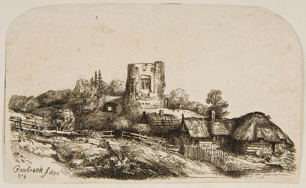Curator: This is Jean Jacques de Boissieu's "Landscape with a Bridge on Three Piles," housed right here at the Harvard Art Museums. There's no known date for it. Editor: It feels like a memory, a ghostly echo of a grander, older time. The textures pull you in. Curator: Boissieu, born in 1736, situated himself within a Europe grappling with shifting power structures. The crumbling architecture becomes a reflection of societal decay. Editor: Yet, those figures crossing the precarious bridge suggest resilience, a quiet continuation despite the ruins. What do you make of the temple on the hill? Curator: It's a nod to classical ideals, even as the present landscape is marked by disrepair. The bridge itself becomes a metaphor for negotiation across divides. Editor: I see it as a humble path forward, built on simple means. Perhaps that's what endures, not empires, but bridges. Curator: A compelling thought, viewing it through the lens of lived experience. Editor: Yes, it shifts the emphasis from grand narratives to the individual’s journey.