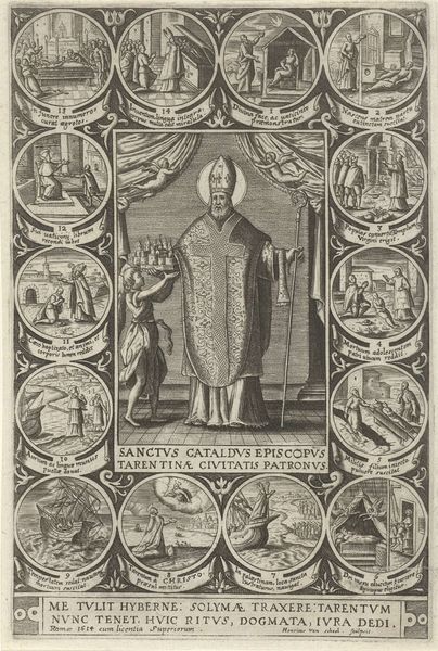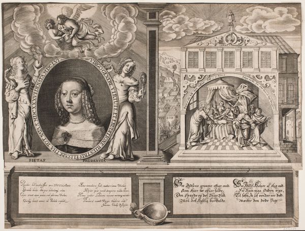 Editor: So, this print is called "Gregers Friis til Ålstrup samt Kristus på korset og Kristi opstandelse. Omgivet af aneskjolde," made in 1656 by Hans Andreas Greys. It's an engraving. It seems really dense with information, almost like a family tree intertwined with religious symbolism. What strikes you when you look at it? Curator: The density you point out is exactly what draws me in. It’s a potent representation of Baroque sensibilities – the theatricality, the intertwining of the earthly and the divine, the blatant display of power through lineage. It practically begs us to consider its social context. Whose story is being told here, and why is it being told in this way? Editor: You mean like, what did it mean to showcase your family’s crest alongside images of Christ’s crucifixion and resurrection? Curator: Precisely. The juxtaposition isn’t accidental. Think about the Reformation's impact on art, and how the rising merchant classes adopted symbols of power traditionally reserved for royalty. Heraldry was deeply connected to social identity and political power. Now, consider Gregers Friis positioning himself within this symbolic framework. What does that tell us about his ambitions? Is he simply memorializing himself or trying to legitimize a specific status? Editor: It's almost like he is trying to align his family’s legacy with a sense of divine right, by including a family portrait. So, the inclusion of those shields gives insight into issues of power and status in the 17th century? Curator: Absolutely! And consider how accessible such imagery was, given its medium as a print. Who was this image intended for? How did the distribution of images impact social and political ideas and values at the time? Remember, these images participated in forming collective memory and influencing identities. Editor: I never considered prints in that way - more than just artworks, they become vehicles for spreading ideologies and building identities. Curator: Exactly! And the study of these works gives a powerful insight into history.
