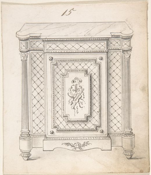Editor: Here we have a "Design for Bed and Canopy" created sometime between 1841 and 1884 by Charles Hindley and Sons. It's a pencil drawing and what immediately strikes me is the almost overwhelming ornamentation. It looks incredibly… well, impractical for sleeping. What statements do you believe this work makes, either about itself or the world at the time? Curator: Well, it’s a drawing, of course, but consider what it represents: aspirational design for a very specific socio-economic class. Look at the details - the crest, the elaborate draping. These aren't simply decorative; they are signifiers of power, wealth, and status during the Victorian era. Editor: So, it's less about comfort and more about projecting an image? Curator: Exactly! This design, meant for the upper classes, tells us a lot about the prevailing ideologies. Who had access to such luxury? What systems had to be in place for such elaborate design to be commissioned and crafted? Think about the labor involved, and who benefitted, and who did not. This isn't just about aesthetics, it’s about power dynamics made manifest in material culture. Does viewing it through this lens shift your initial perception of its impracticality? Editor: Absolutely, it does. I initially saw the drawing at face value, but thinking about the economic and social context makes it a lot more powerful. It seems to me like it makes the inequality that underpinned that society all that more explicit. Curator: Precisely. Even a drawing of a bed can serve as a window into understanding broader, often uncomfortable, truths about society. Editor: Thank you. Now I see it’s about so much more than just design.